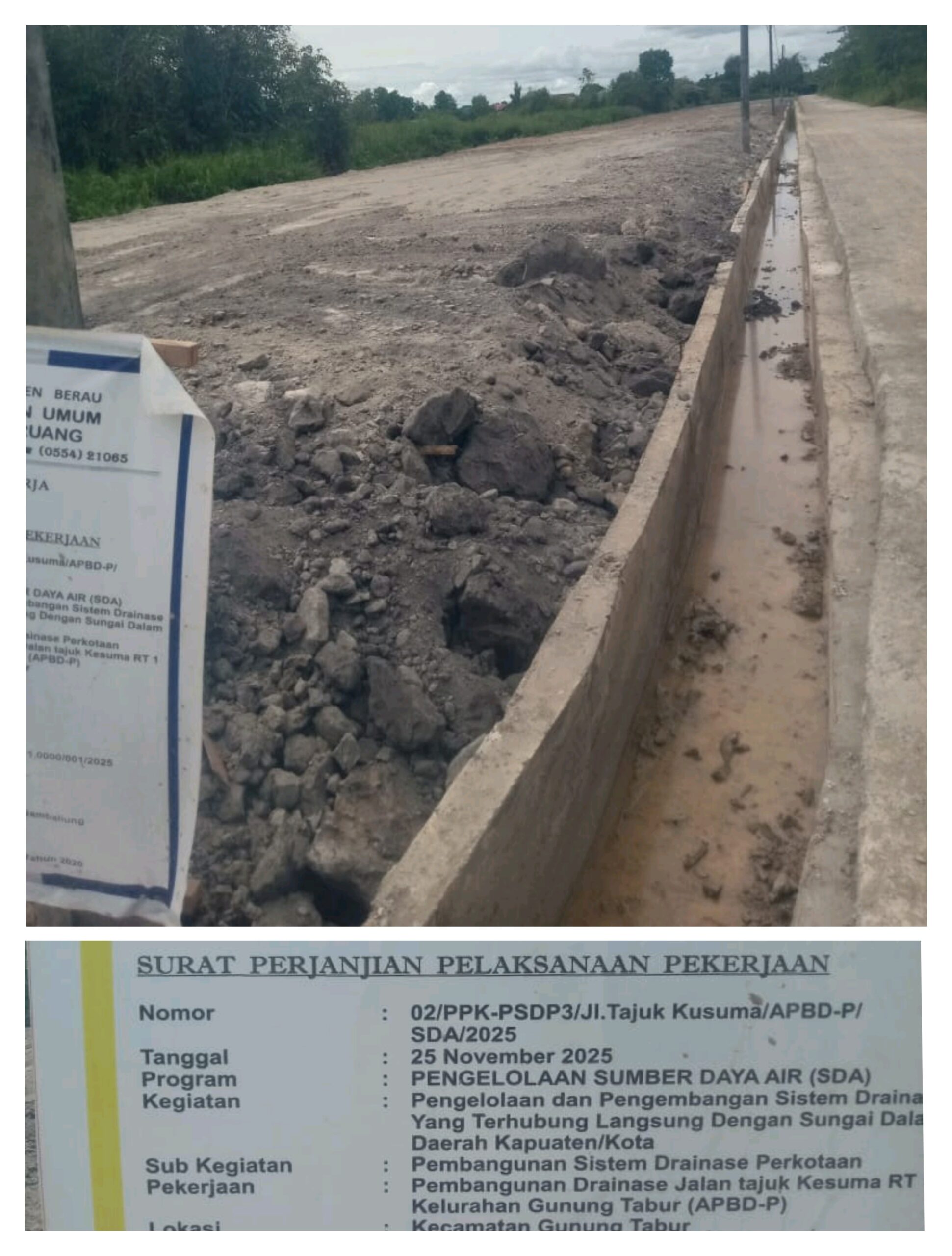 Kegiatan Pembangunan Drainase di Jalan Tajuk Kesuma RT 01, Kelurahan Gunung Tabur, diduga dikerjakan asal jadi dan jauh dari harapan warga. Rabu (21/01/2026).